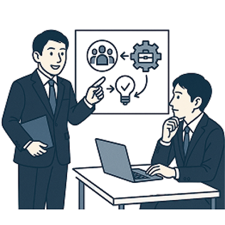 本プロジェクトは、まず講師があなたの営業スタイルを見極め、足りない部分を補い、伸ばすべき部分を伸ばすというマンツーマンの指導を行います。